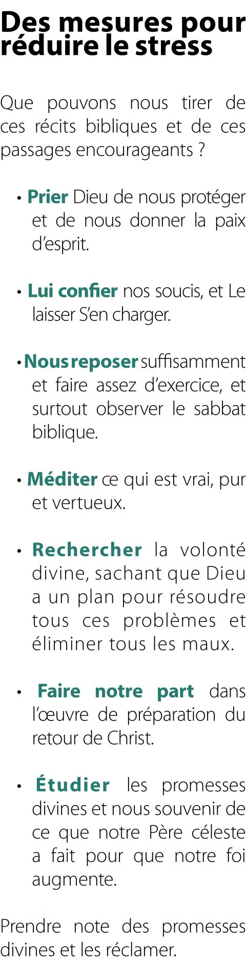 Quand nous affrontons la peur et le stress, Dieu veut que nous ayons de nouveau les yeux fixés sur Lui et sur l’œuvre qu’Il veut nous voir accomplir. Cette œuvre implique des milliers d’autres personnes qui, elles aussi, œuvrent pour se préparer pour le retour de Christ – le seul espoir que ce monde malade ait. (Lire à cet effet nos articles « Quelle est la mission de l’Église ? » et « Notre espérance en l’avenir ».